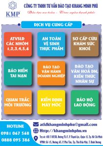 Công ty TNHH Tư vấn và Đào tạo Khang Minh Phú là đơn vị Huấn luyện được cấp giấy chứng nhận đủ điều kiện hoạt động huấn luyện An toàn, vệ sinh lao động trên toàn quốc được Bộ Lao động, Thương Binh & Xã Hội cấp phép.