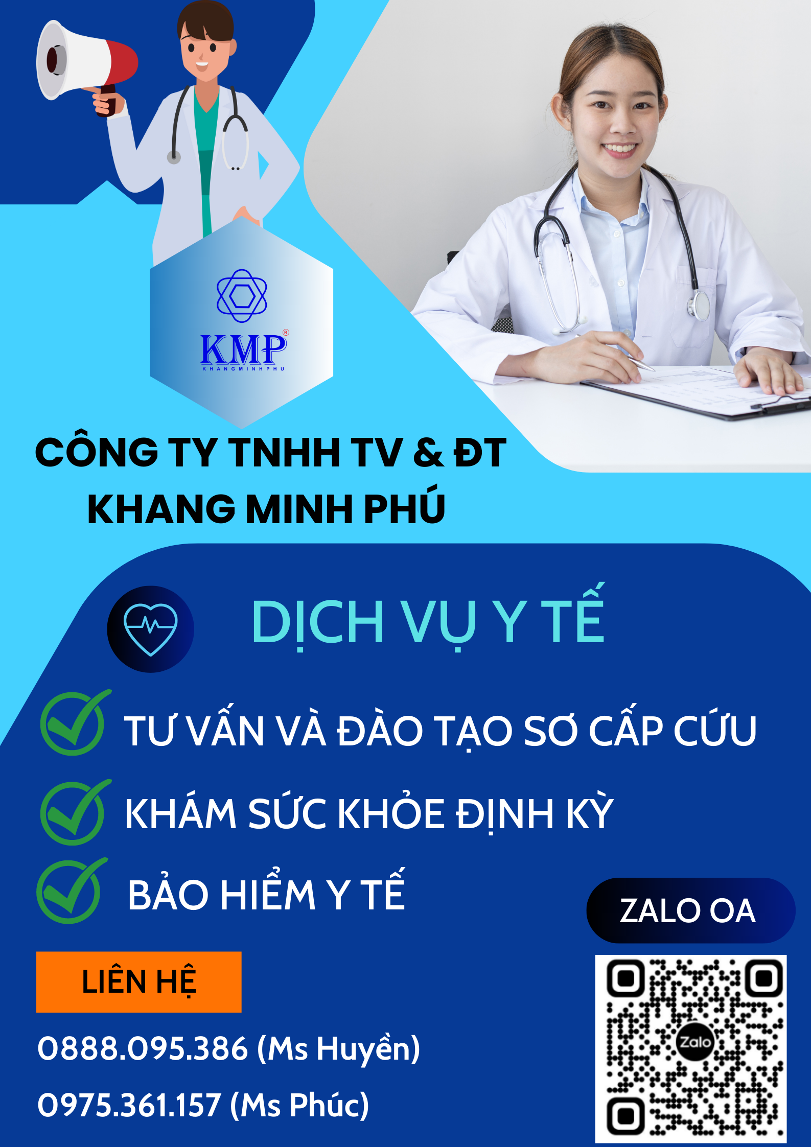 Chúng tôi là Công ty TNHH Tư vấn và Đào tạo Khang Minh Phú, hân hạnh giới thiệu đến quý vị một loạt dịch vụ y tế đa dạng và chất lượng: