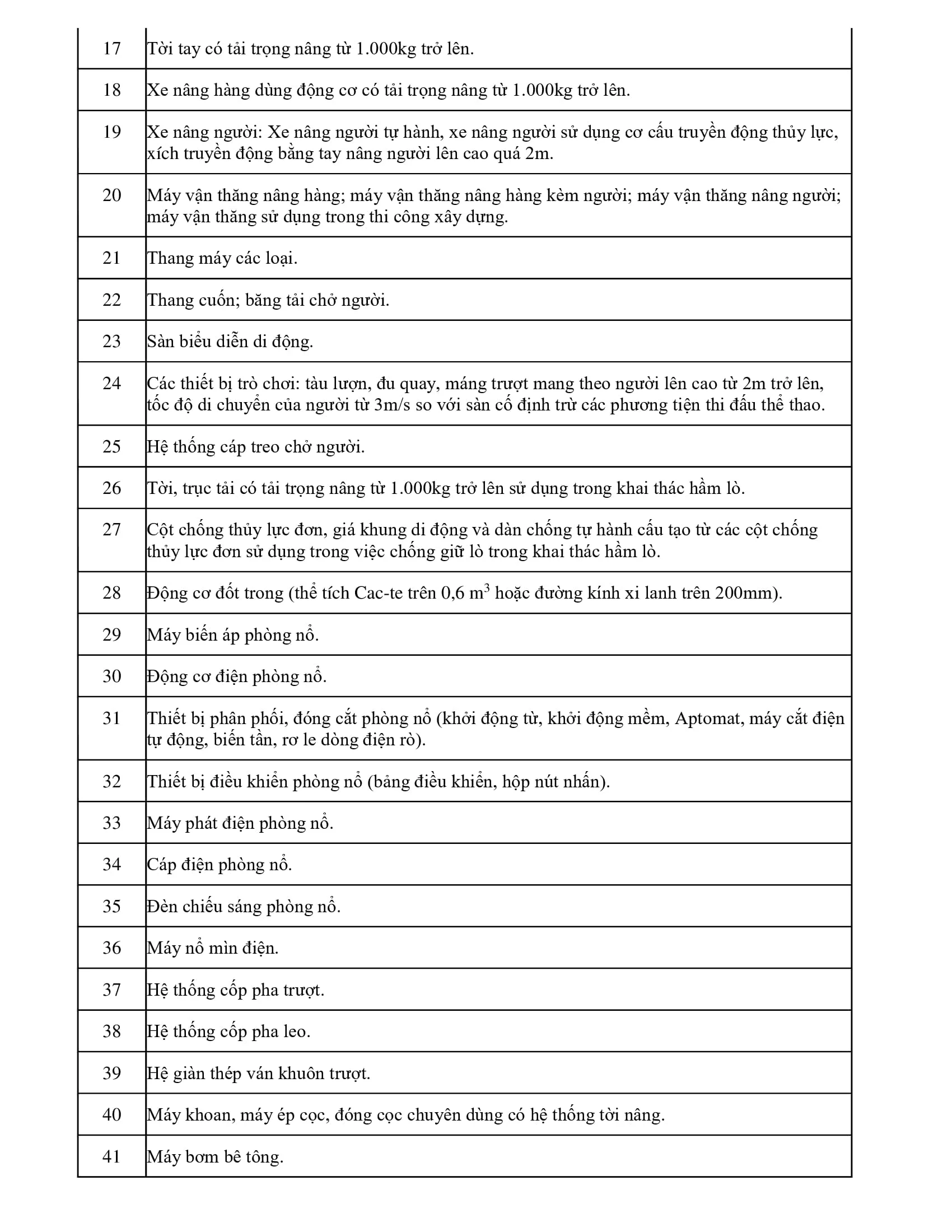 Danh mục máy, thiết bị, vật tư có yêu cầu nghiêm ngặt về an toàn lao động thuộc trách nhiệm quản lý của Bộ Quốc phòng thuộc đối tượng kiểm định được quy định tại Phụ lục II ban hành kèm theo Thông tư 08/2017/TT-BQP (bị thay thế bởi khoản 10 Điều 1 Thông tư 137/2021/TT-BQP) như sau: